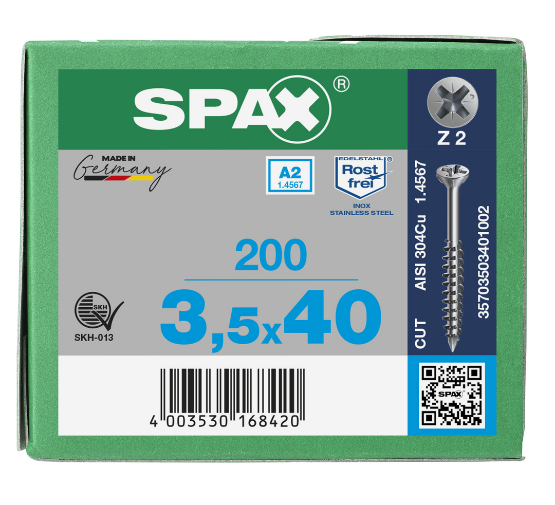 ABC Spax-Glasleistenschrauben A2 Senkkopf, Kreuzschlitz 3,5 x 40/23 mit Fräsrippen, SPAX CUT-Spitze, Teilgew
