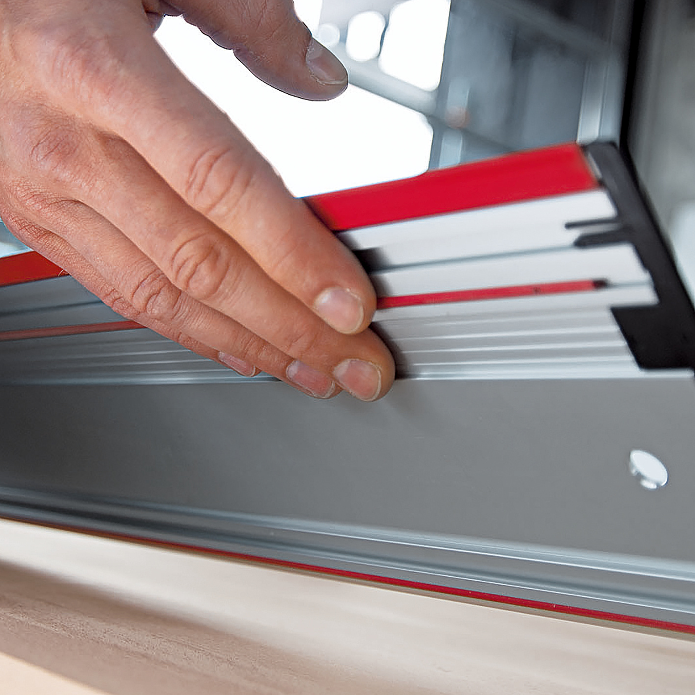 Für den exakten und sauberen Schnitt bietet MAFELL für eine Vielzahl von Maschinen-Typen das neue Führungsschienen-System F an. Die Gummilippe ist Anlegekante und Ausreißschutz in einem. Für optimale Arbeitsergebnisse wird sie vor dem ersten Schnitt auf Ihre Säge eingeschnitten. Der eloxierte Gleitbelag auf der Schienenoberseite fördert eine angenehme Handhabung und verringert den Schubwiderstand der Handkreissäge. Der im Lieferumfang enthaltene Profilabschluß verhindert am Schienenanfang das Verhaken von Kabel und Absaugschlauch. Die Breite der Schiene wurde so gewählt, dass die komplette Maschinen-Grundplatte beim Schnitt darauf gleitet.
