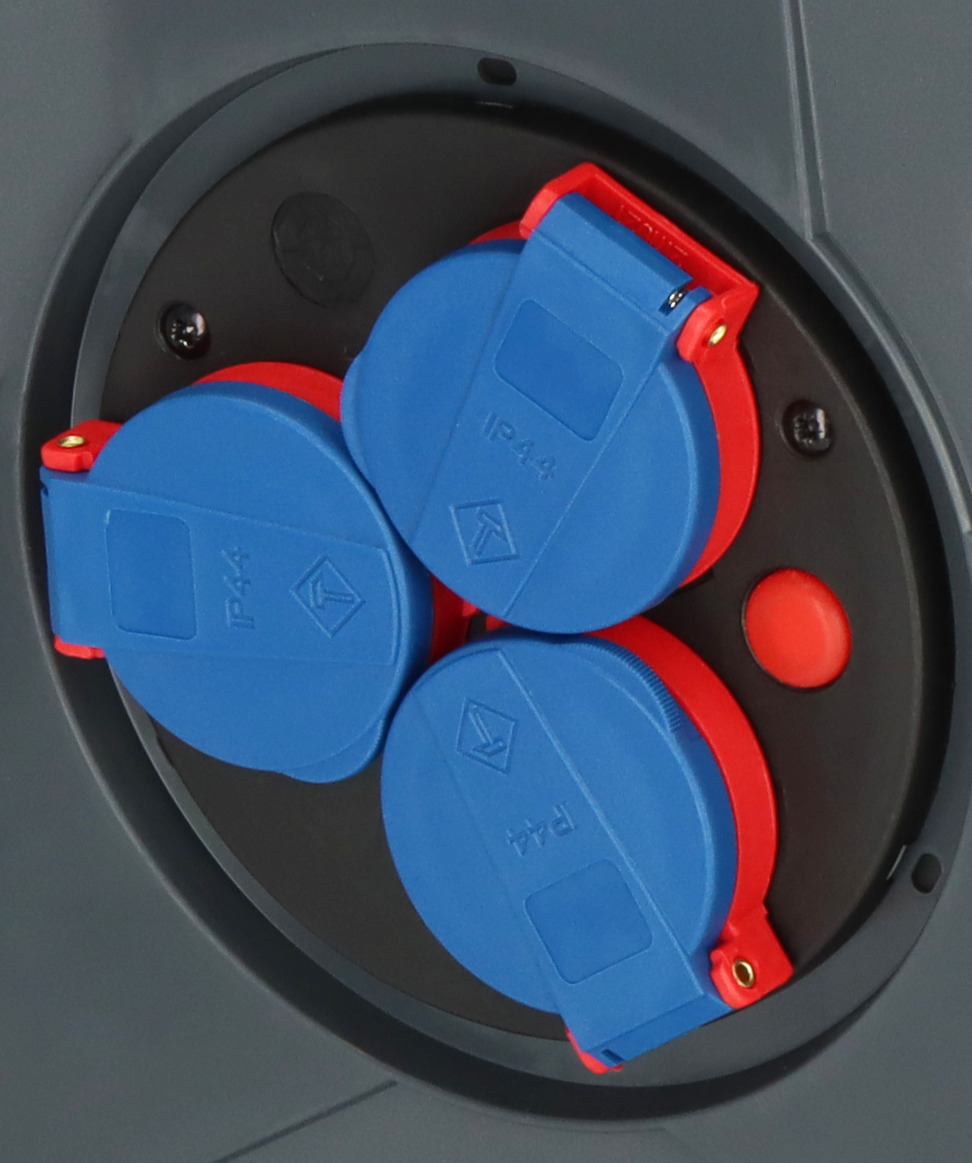 - 3 Schutzkontakt-Steckdosen, spritzwassergeschützt, mit selbstschließenden Deckeln.