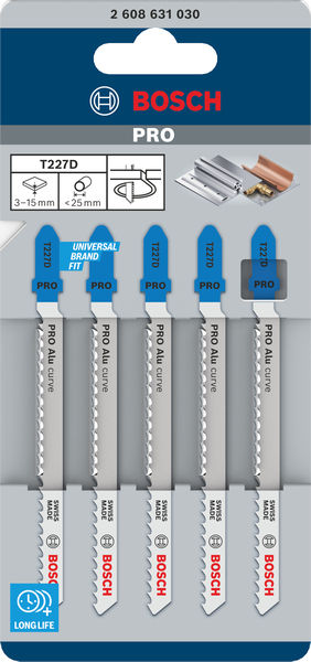 Herausragende Lebensdauer beim Schneiden von Aluminium! Hochgeschwindigkeitsstahl (HSS) für Festigkeit und Hitzebeständigkeit Du bist Metallarbeiter und benötigst ein langlebiges Stichsägeblatt für Kurvenschnitte in Aluminium und Nichteisenmetalle? Dann ist das PRO Alu curve T227D die richtige Wahl. Wir haben es entwickelt, damit du Werkstücke mit einer Dicke zwischen 3 und 15 mm schneiden kannst – immer und immer wieder. Das PRO Alu curve T227D Stichsägeblatt ist eine großartige und langlebige Ergänzung für jede Metallwerkstatt, in der Kurvenschnitte in Aluminium durchgeführt werden müssen. Es wurde aus Schnellarbeitsstahl (HSS) hergestellt, um die Stabilität und Hitzebeständigkeit zu gewährleisten, die du beim Schneiden von Aluminium und anderen Nichteisenmetallen benötigst. Wir haben es mit gefrästen, geschränkten Zähnen und ovalen Spanräumen versehen, um einen gleichmäßigen Schnitt zu gewährleisten. Schneide damit Aluminiumbleche mit einer Dicke von 3 bis 15 mm, Rohre und Profile mit einem Durchmesser von bis zu 25 mm.