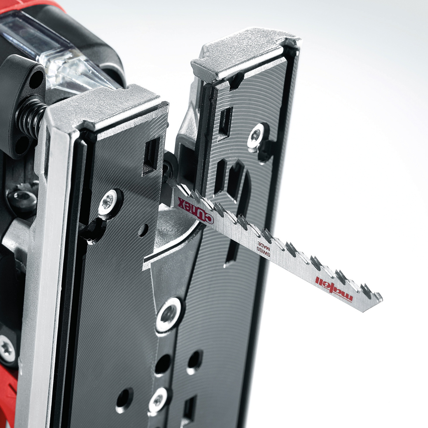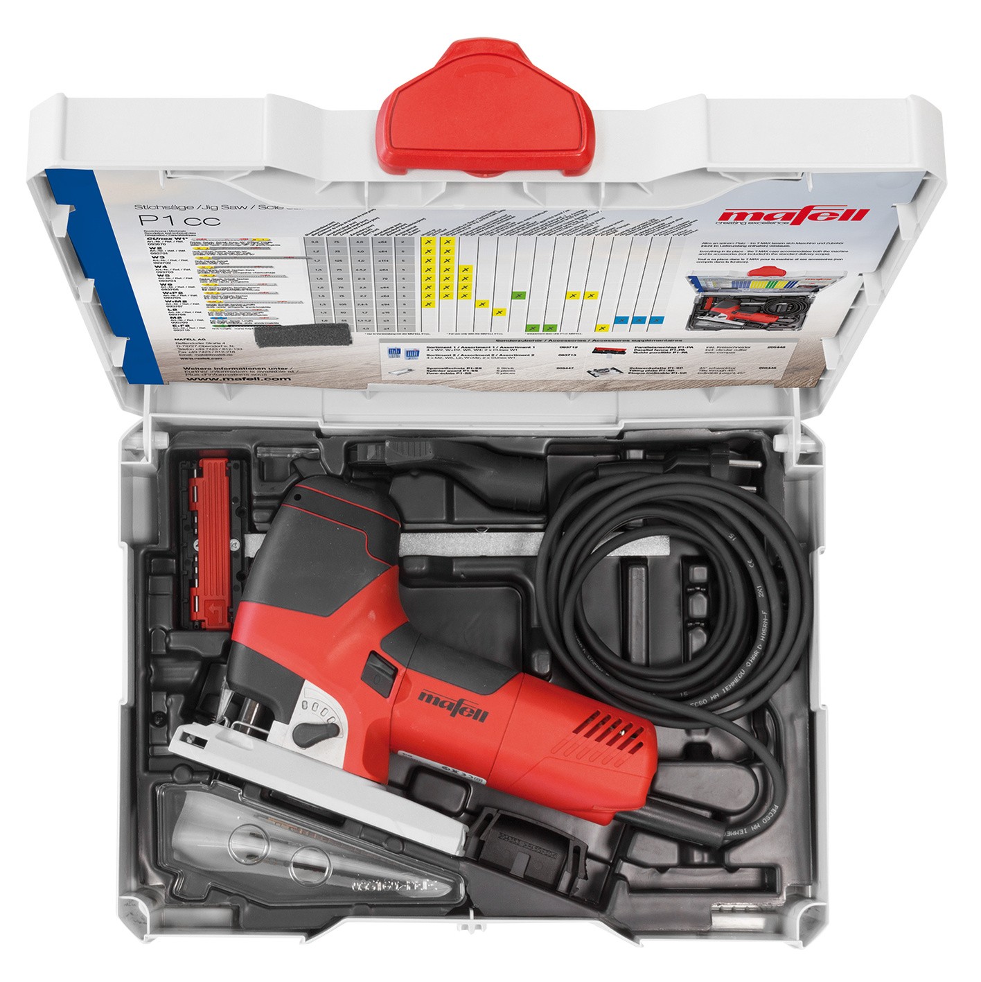 Durch ihr ergonomisches Design mit niedrigem Druckpunkt und Softeinlagen liegt die P1 cc in jeder Situation optimal in der Hand. Dank der ausgefeilten Eigenabsaugung und einer cleveren Freiblaseinrichtung ist die Schnittfläche sogar ohne angeschlossenen Staubsauger immer frei von Spänen. Bei der P1 cc lässt sich zur exakten Anpassung an das Material die Drehzahl von 800 - 3000 Hüben/Min. stufenlos einstellen. Die Grundplatte mit dem integrierten Absaugkanal ist so stabil, wie sie aussieht. Mit dem werkzeuglosen Schnellverschluss ist sie immer exakt rechtwinklig an die Stichsäge angebunden. Das durchdachte Zubehör verleiht der P1 cc eine einzigartige Vielseitigkeit. Besonders das neue MAFELL Präzisionssägeblatt CUnex W1 ermöglicht dank seiner neu entwickelten Bauform einzigartig exakte Schnitte.