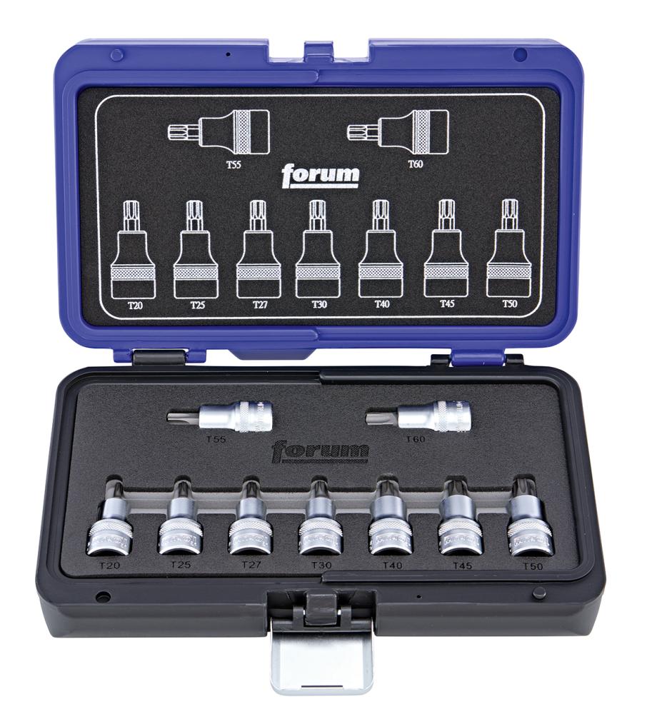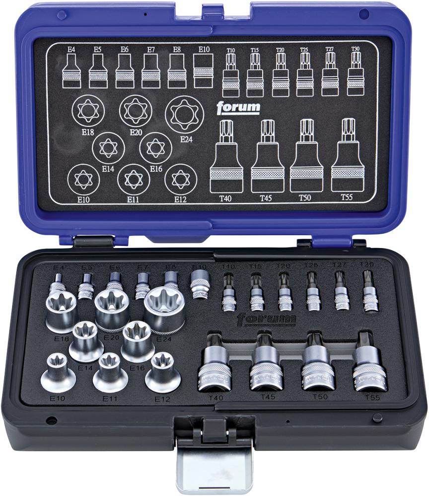 • Seidenmattes Finish • Qualitätsstahl C60 • Spitze matt grau • 4-kant-Antrieb DIN 3120-D 12,5; ISO 1174 • Kugelfangrille Lieferung: Im Kunststoffkasten. Inhalt: 6 Schraubendreher-Einsätze 1/4" für TORX®-Schrauben T 10; T 15; T 20; T 25; T 27; T 30 4 Schraubendreher-Einsätze 1/2" für TORX®-Schrauben T 40; T 45; T 50; T 55 6 Steckschlüssel-Einsätze 1/4" für TORX®-Schrauben E 4; E 5; E 6; E 7; E 8; E 10 8 Steckschlüssel-Einsätze 1/2" für TORX®-Schrauben E 10; E 11; E 12; E 14; E 16; E 18; E 20; E 24