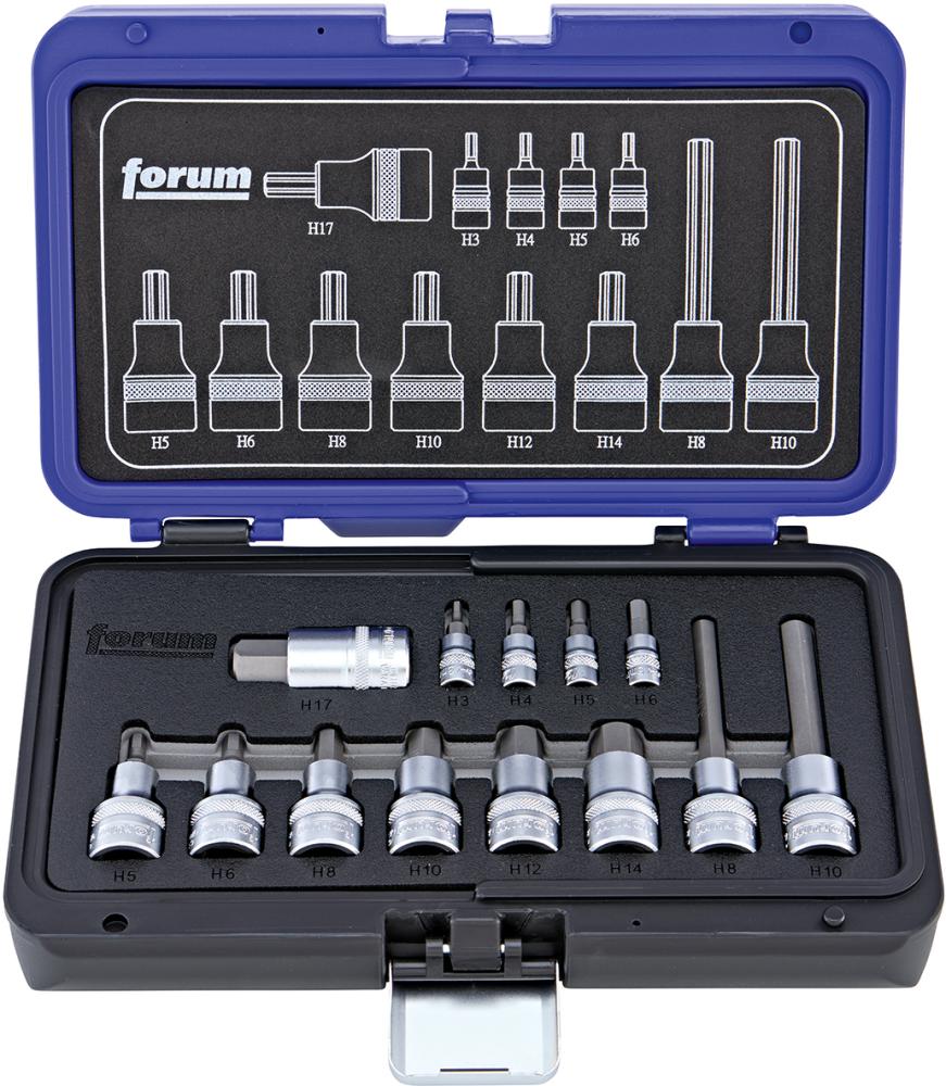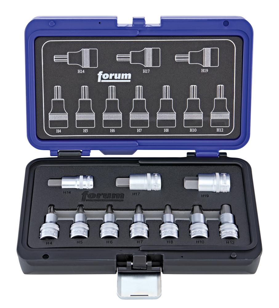 • 4-kant-Antrieb DIN 3120-D 12,5; ISO 1174 • Kugelfangrille • Griffige Kreuzrändelung Lieferung: Im Kunststoffkasten. Inhalt: 10 Schraubendreher-Einsätze 1/2" für 6-kant-Schrauben 4; 5; 6; 7; 8; 10; 12; 14; 17; 19 mm.