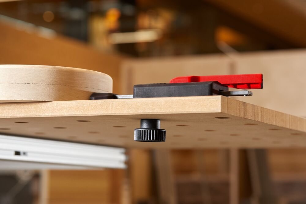 Zum Einsatz auf Multifunktionstischen wie z.B. Festool MFT und Sortimo WorkMo mit Lochdurchmesser 20 mm und Plattenstärke von min. 19 mm